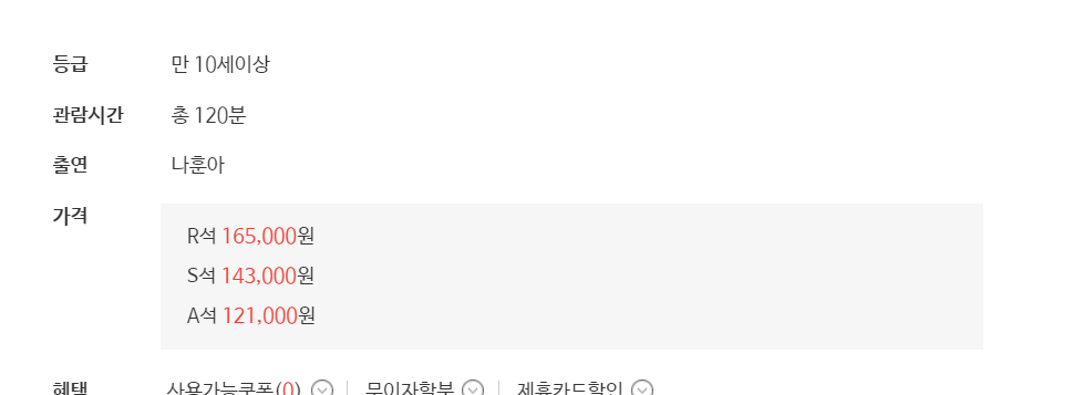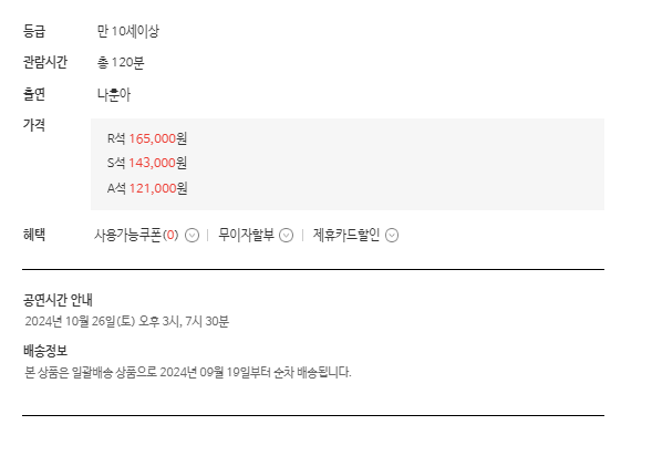 만 10세 이상 관람가능하며, 총 120분 공연 진행, 티켓 가격은 R석 165,000원, S석 143,000원, A석 121,000원 입니다.