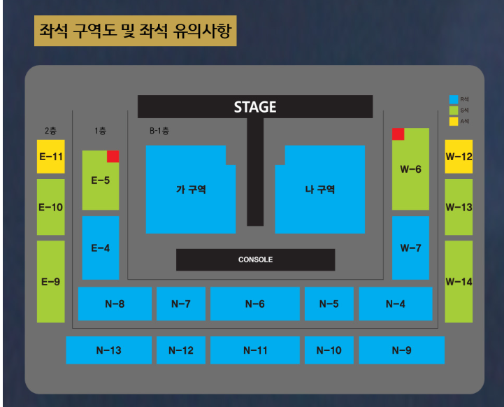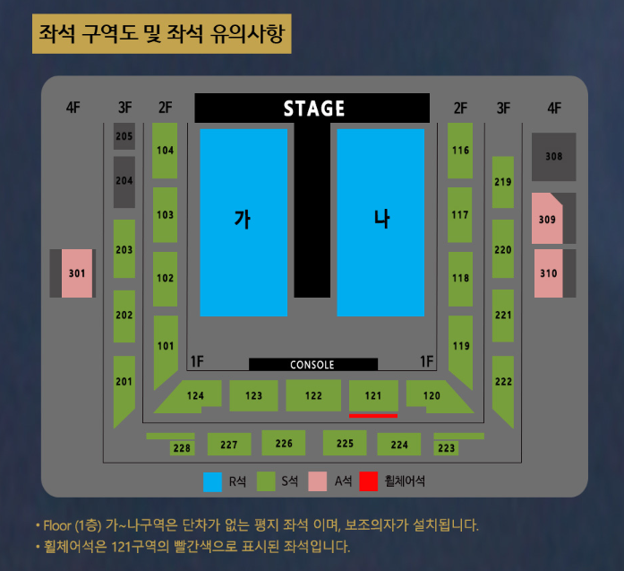 FLOOR(1층)가~나 구역은 단차가 없는 평지 좌석 이며, 보조의자가 설치되고 휠체어석은 121구역의 빨간색으로 표시된 좌석이니 미리 확인하시고 예매하시기 바랍니다.